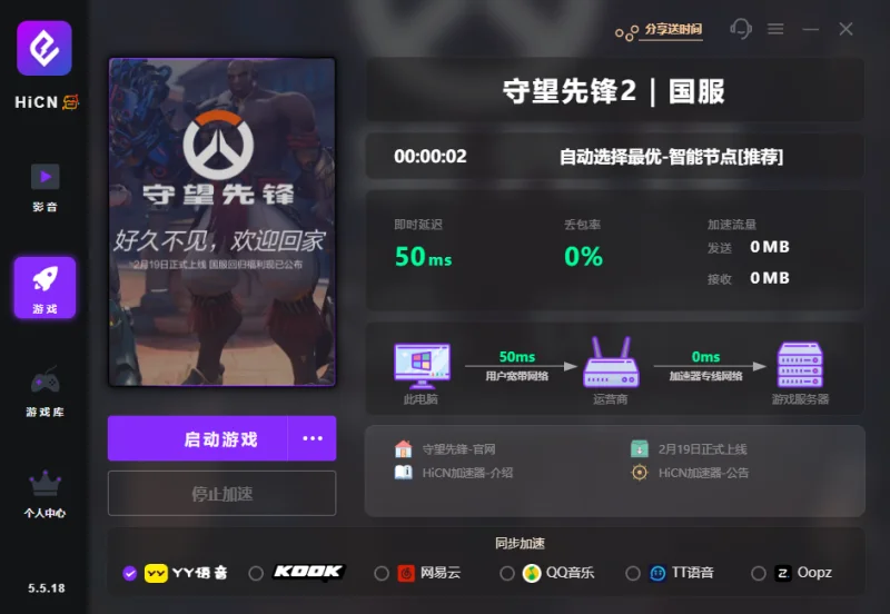 HiCN 回国加速器在部署大量的服务器节点,有效优化网络传输路径。当海外玩家启动加速器并选择加速守望先锋 2国服时,加速器会自动为玩家匹配最佳的服务器节点,使数据能够更快速、稳定地传输到国服服务器: