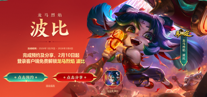 马年限定免费领:预约+登录即可直接领取全新马年限定皮肤【龙马烈焰 波比】!