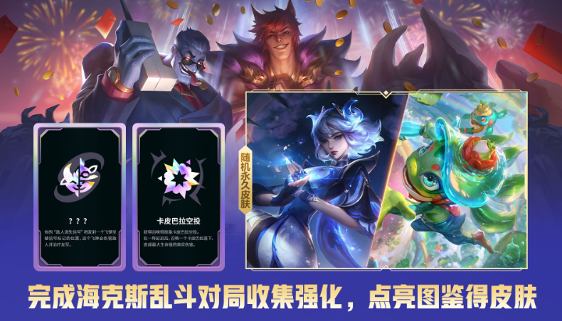 乱斗加码:海克斯大乱斗福利升级,收集强化图鉴即可领取一款随机皮肤。