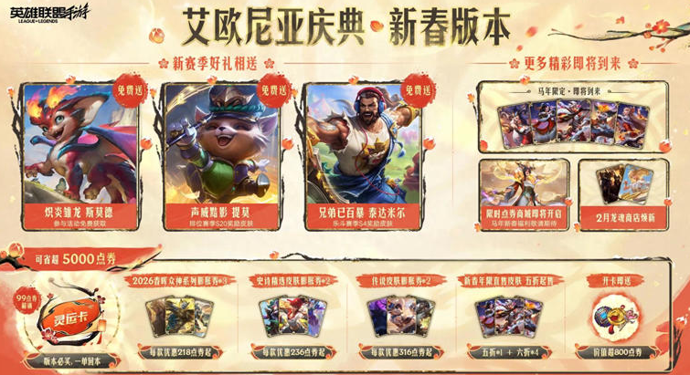 ⏰ 活动时效: 所有福利均为2026年新春版本限时活动,想要白嫖皮肤和享受折扣的召唤师,务必抓紧时间上线,错过了可能就要等一年!