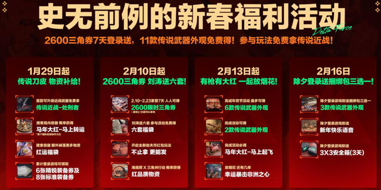本次三角洲行动新春福利诚意满满,从 2 月 10 日起福利轮番上线,数量和质量双在线,跟着节奏走,轻松薅遍所有福利:
