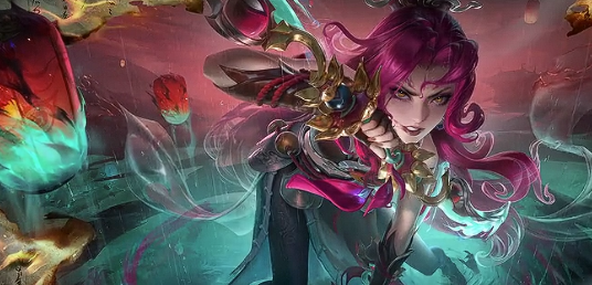 这款皮肤以中式志怪异闻为灵感,整体配色采用醒目的玫红色与冷厉的玄黑。阿轲身上缠绕着诡秘的妖纹,青金色点缀其间,展现出神异之姿。设计师融合了国风工笔意境与妖灵传说的诡谲,塑造出一位在罗刹海市所向披靡的强大形象。