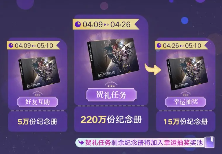 随着4.1版本前瞻直播的脚步越来越近,加上当前版本周期的微调,很多开拓者都在搓手期待:崩铁的四周年庆典是不是马上就要震撼登场了?作为第四个重磅周年版本,官方发福利的手笔绝对不会小。今天姥爷就带大家提前盘点一下,备受瞩目的四周年实体纪念册活动大概率会有哪些获取门槛。
