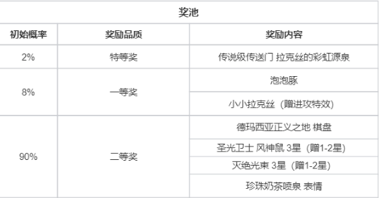 这次活动从3月26日到5月27日,首次夺宝只要6元。奖池一共7个奖励,不会重复,第4次内必出一等奖以上,第7次内必出特等奖。奖励包括传说级传送门「拉克丝的彩虹源泉」、小小拉克丝、泡泡豚等。4月1日神话棋盘「拉克丝的德玛西亚白日梦」也会限时回归。