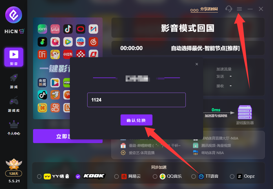 用户输入口令 1124 即可免费领取加速时长:手机端在主页输入口令 1124,电脑端在官网右上角选择“口令兑换”输入 1124 即可。
