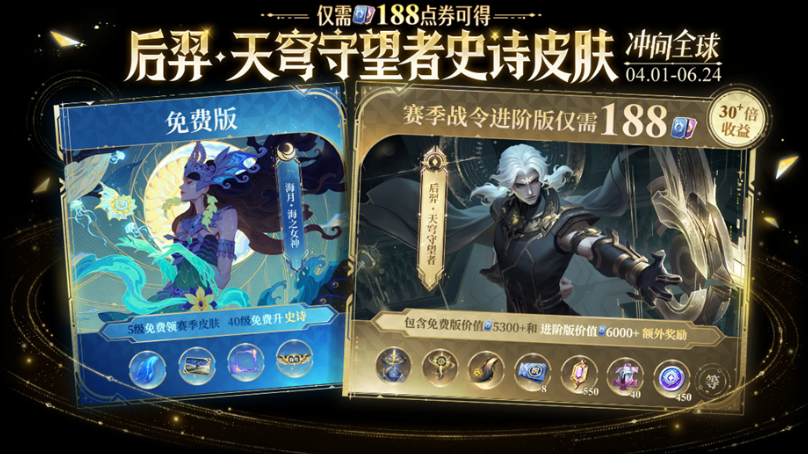 S43赛季战令开启,免费版能拿海月新皮肤“海之女神”,进阶版188点券可得后羿“天穹守望者”。