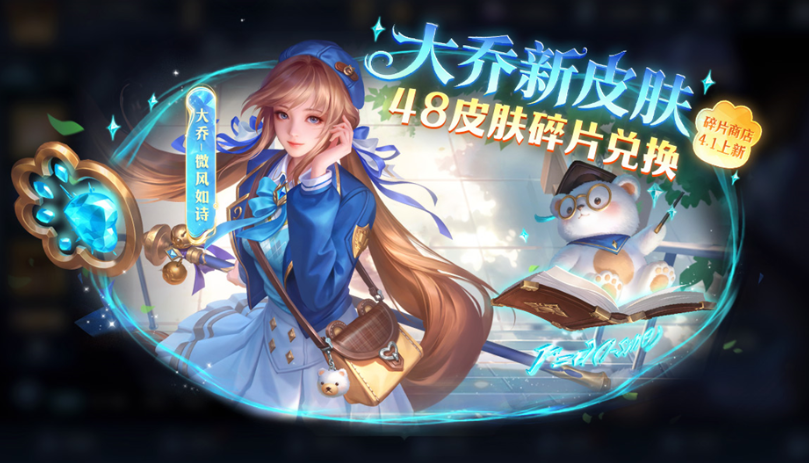 大乔新皮肤“微风如诗”加入碎片商店,48碎片就能换,勇者品质,魔法学院风还挺好看的。钟无艳“春野之旅”也限时返场,同样48碎片兑换,这次返场结束后就不再直售了。
