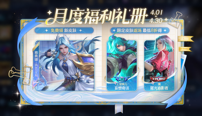 4月3日到6日,全英雄限免,包括敖隐和武则天,还有多款精选皮肤也能免费用,假期组队正合适。