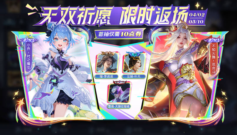 小乔“时之魔女”、不知火舞“花合斗”无双皮肤,以及女娲“补天”、曜“李逍遥”等限定皮肤通过无双祈愿返场。孙策珍品传说皮肤也回来了。蔬菜精灵联动天幕也开了祈愿,首抽10点券。