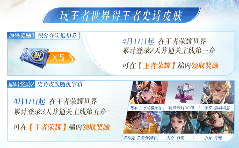 积分夺宝券:在《王者荣耀世界》累计登录2天,并且通关主线第三章,就能领。