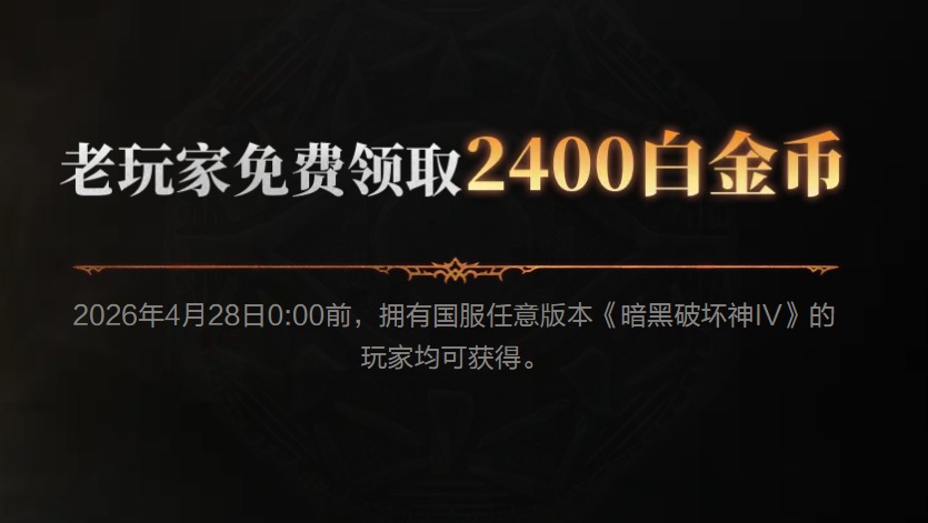 对于此前已拥有任意版本国服《暗黑破坏神 4》的老玩家,活动期间可直接领取 2400 白金币奖励。白金币可用于解锁外观道具、补充游戏内消耗品等,价值相当于 141 元。