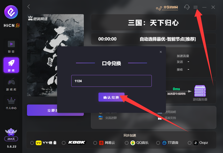 兄弟们,最近在玩《三国天下归心》这款国服手游,孙尚香是真的猛,但如果你和我一样人在海外,打国服经常遇到延迟飘红、技能放不出来的尴尬。别急,先搞一个HiCN回国加速器,输入口令1124就能免费领会员时长,手机端在主页输入口令,电脑端官网右上角“口令兑换”同样输1124。电脑去hicn01.com下载,手机在谷歌商店或AppStore搜“HiCN”就行。延迟稳了,孙尚香的箭才射得准!