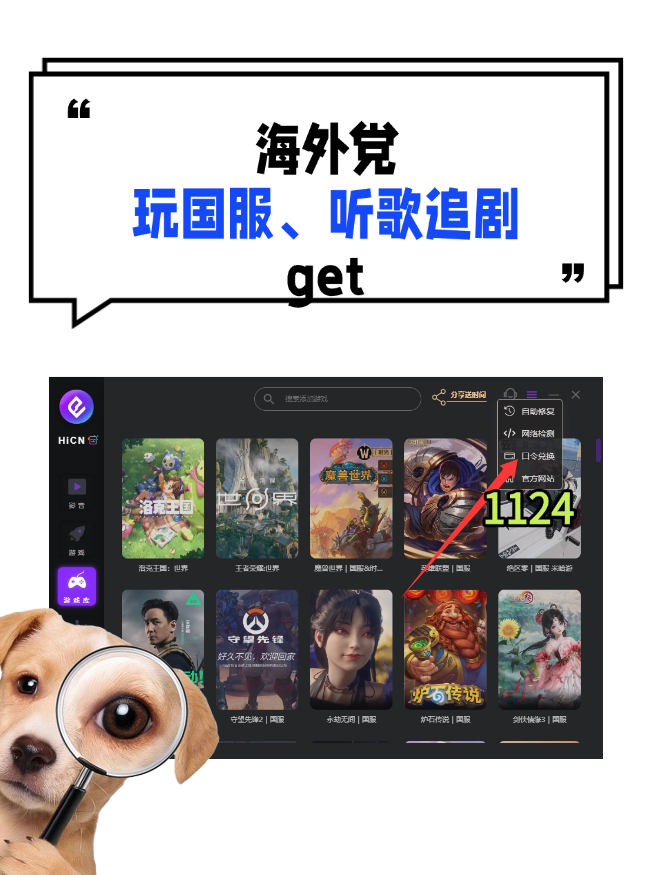 电脑用户访问官网 hicn01.com 下载客户端;手机用户在谷歌商店或 App Store 搜索“HiCN”即可安装。新用户登录后,在手机主页输入口令 1124,或在电脑端官网右上角选择“口令兑换”并输入 1124,就能免费领取加速时长。有了它,从海外连国服打《异环》,延迟高、丢包、加载慢的问题都能大幅缓解,领兑换码、抽卡、跑图都顺滑不少。