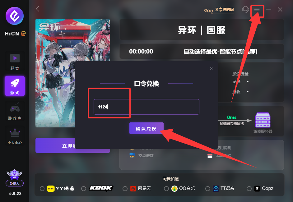 如果你人在海外,网络不稳定的话,兑换页面都可能打不开。我的经验是:先启动HiCN回国加速器,选好节点,再打开游戏。这样不仅兑换码秒到账,后面刷日常、抽卡、打副本都不会掉线。