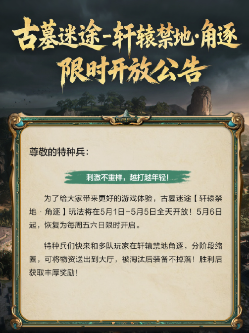 哈喽各位特种兵!和平精英七周年活动真的是一波接一波。刚看到官方发的公告,古墓迷途系列又出新花样了——【轩辕禁地·角逐】玩法限时上线,五一期间直接全天开放,这下可以痛快肝几天了!