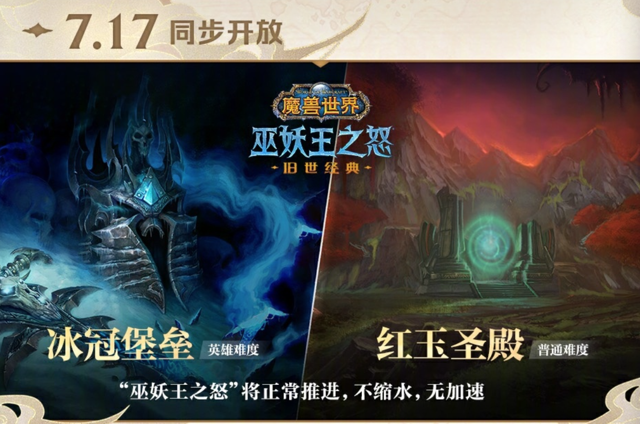 怀旧服还有不少福利。7 月 17 日到 8 月 14 日有 50% 经验加成,练小号速度超快。全服玩家合力完成任务,能白嫖暗色凤凰坐骑、祖阿曼斗熊和熊猫人僧侣小宠物。WLK 怀旧服还同步开放了英雄难度冰冠堡垒和普通红玉圣殿,装备掉落和原来一样,没缩水。
