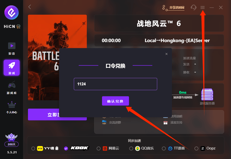 1. 下载 HiCN 回国加速器并安装,用口令 “1124” 激活会员;