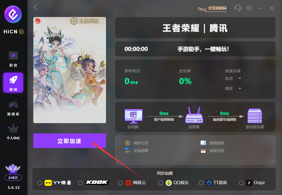 完成注册登录后,在游戏库中选择《王者荣耀》国服,点击 “一键加速” 即可启动优化。现在输入口令:HiCN666,还能领取 VIP 加速时长,畅享更流畅的对战体验。