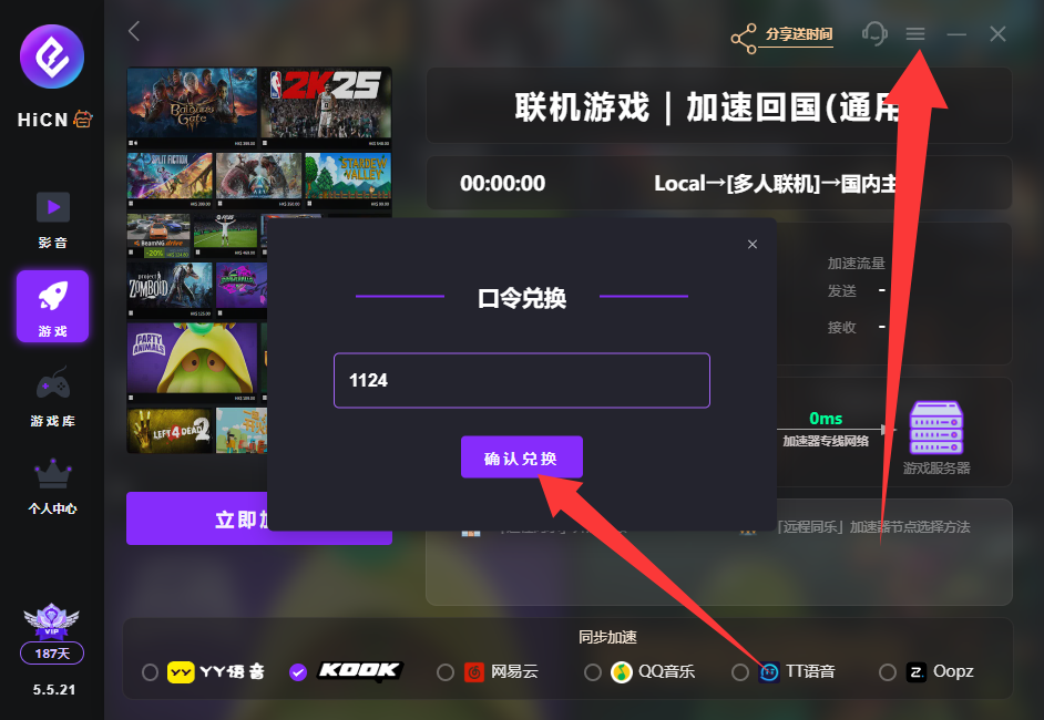 下载安装 HiCN 后,打开点击底部【我的】→【口令兑换】,输入专属口令【1124】,领取 7 天免费会员;