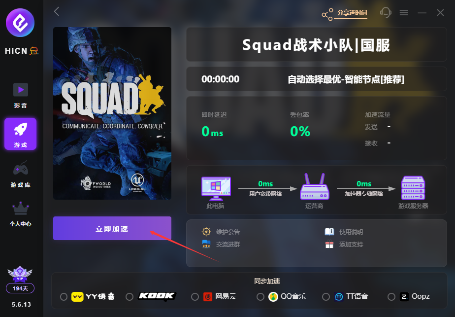 玩家只需下载并安装适配的 HiCN 客户端,完成注册登录后,在游戏库中找到 “战术小队国服”,点击一键加速即可。现在输入专属口令:HiCN666,还能领取额外的 VIP 加速时长。