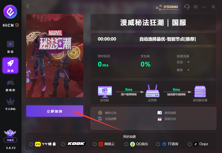 2,在加速器 “游戏库” 中搜索 “漫威秘法狂潮”,点击 “一键加速”,系统会自动匹配延迟最低的专属节点;