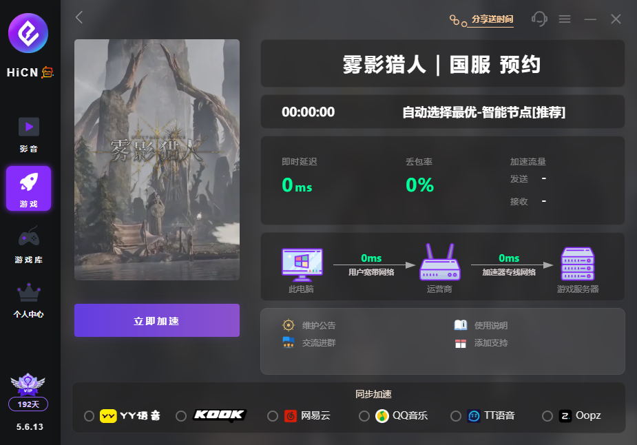 玩家只需三步即可轻松解决网络困扰:在 HiCN 官网或应用商店下载对应设备客户端,完成注册登录;在 “游戏库” 中搜索 “雾影猎人(国服)”,点击 “一键加速”,系统将自动匹配延迟最低的专属节点;待加速成功后启动游戏,即可顺畅加载、稳定登录,尽情享受狩猎乐趣。