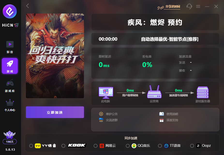 下载并安装适配的 HiCN 加速器客户端,在搜索栏输入 “疾风:燃烬(国服)”,点击 “一键加速” 即可完成适配。输入专属口令HiCN666,还能额外领取 VIP 加速时长享受优质加速服务。