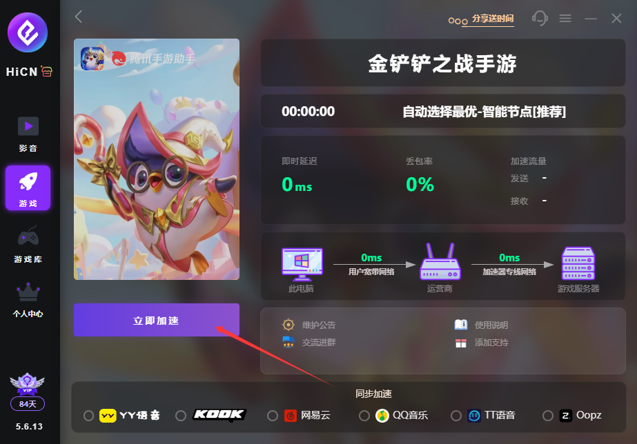 HiCN操作流程简单便捷:玩家下载适配的 HiCN 客户端后,搜索 “金铲铲之战” 并点击一键加速,即可快速适配国服服务器;输入专属口令HiCN666,还能额外领取VIP加速时长。