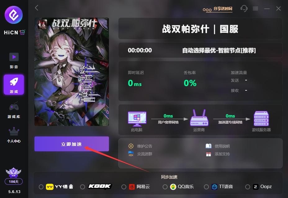HiCN 加速器操作便捷,玩家只需三步即可开启加速:下载适配的 HiCN 客户端,搜索 “战双帕弥什(国服)”,点击 “一键加速” 完成适配,无需复杂设置;输入专属口令HiCN666,还能领取 VIP 加速时长,畅享稳定加速服务。