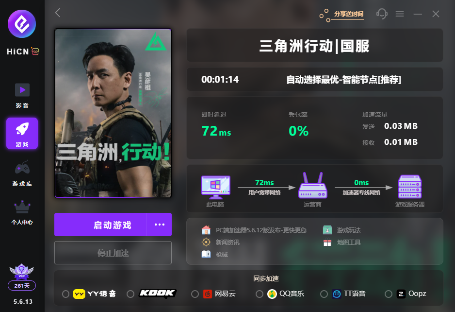 HiCN 操作十分简便,玩家下载适配客户端后无需复杂设置,在游戏库找到《三角洲行动》国服一键即可开启加速;现在输入口令HiCN666,还能领取 VIP 加速时长,轻松畅享流畅对战体验。