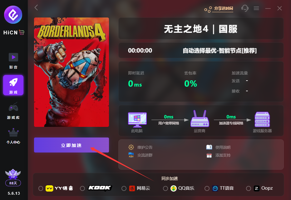 HiCN 操作十分便捷,玩家下载适配客户端后无需复杂设置,在游戏库找到《无主之地 4》国服一键开启加速即可;现在输入专属口令HiCN666,还能领取 VIP 加速时长,轻松畅享流畅联机体验,助力海外玩家与队友畅快开启《无主之地 4》的冒险之旅。