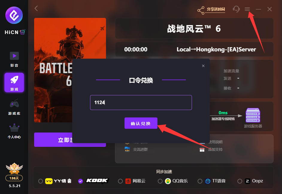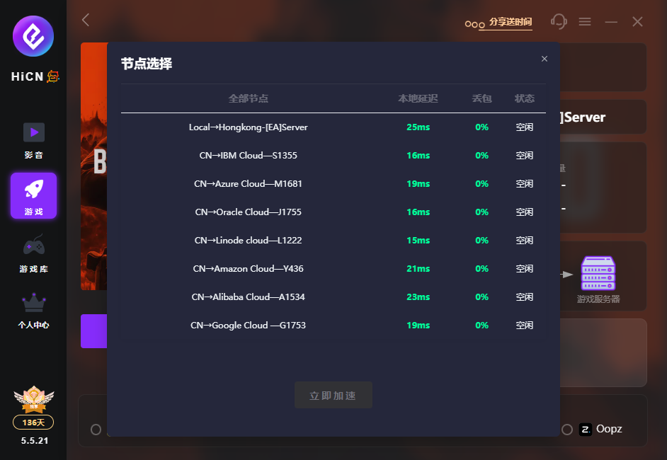 加速专属通道:用HiCN 加速器锁定稳定连接,搜索 “战地 6” 选择对应服务器专线