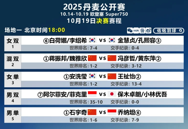 国羽混双提前锁定丹麦公开赛冠亚军,石宇奇力克安赛龙、王祉怡晋级决赛,今晚 18:00 就能看巅峰对决!