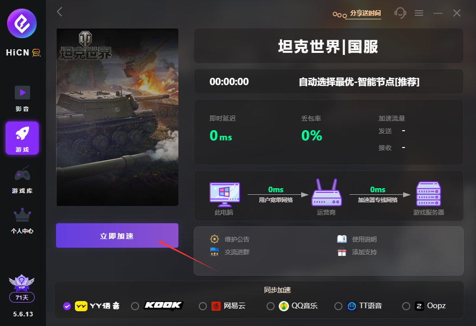 HiCN 在操作便捷上十分友好。玩家下载安装对应客户端后,无需复杂的网络设置,只需注册登录,在游戏库找到 “坦克世界 - 国服”,点击 “一键加速”,就能快速完成线路优化,即使是不熟悉网络操作的新手,也能轻松上手。同时,HiCN 海外回国加速器支持多设备同步使用,玩家不仅能在电脑上畅快玩《坦克世界》国服,还能在手机等移动设备上灵活使用,满足不同场景的游戏需求。