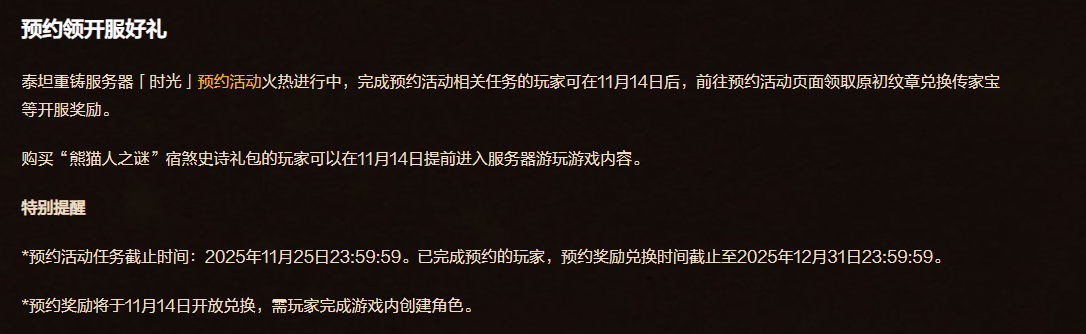 《魔兽世界》泰坦重铸「时光」服务器的开服时间终于尘埃落定,根据暴雪娱乐与网易官方公告,魔兽世界时光服将于 11 月 18 日正式全量开服,所有完成预约的玩家均可登录体验。而购买 “熊猫人之谜” 宿煞史诗礼包的玩家,可在 11 月 14 日提前进入服务器,比普通玩家多 4 天的准备时间,抢占发育先机。