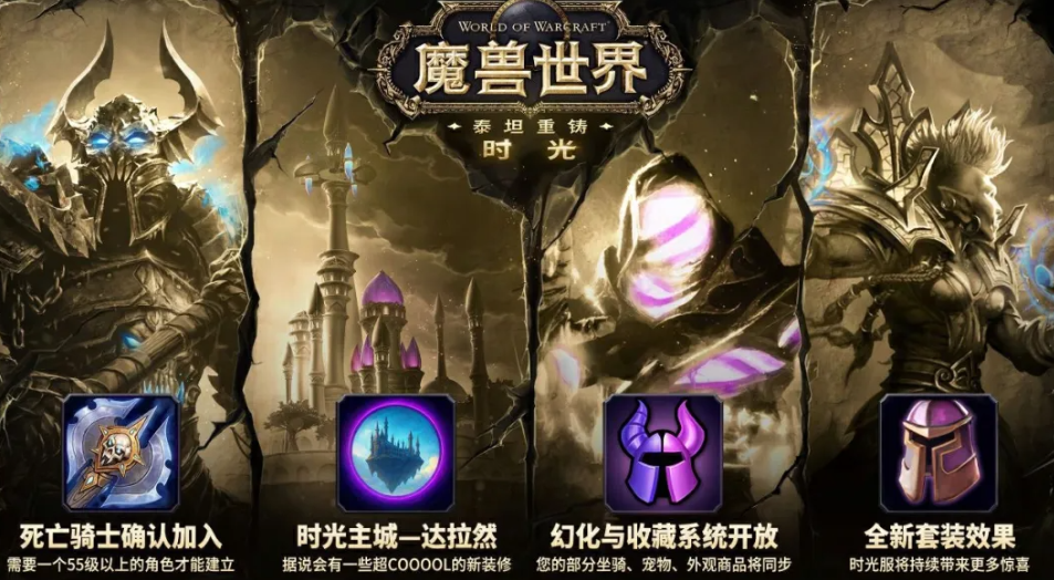 时光服采用独立服务器架构,与现有怀旧服数据不互通,所有玩家需从 1 级开始创建新角色开启冒险。不过其升级体验已做优化:一方面,任务流程大幅精简,经典任务的跑路距离缩短 30% 以上;另一方面,跨版本装备继承机制让前期装备淘汰速度放缓,新手也能快速成型。值得注意的是,死亡骑士职业需先创建一个 55 级以上的其他角色才能解锁,想首发 DK 的玩家要提前规划练级节奏。