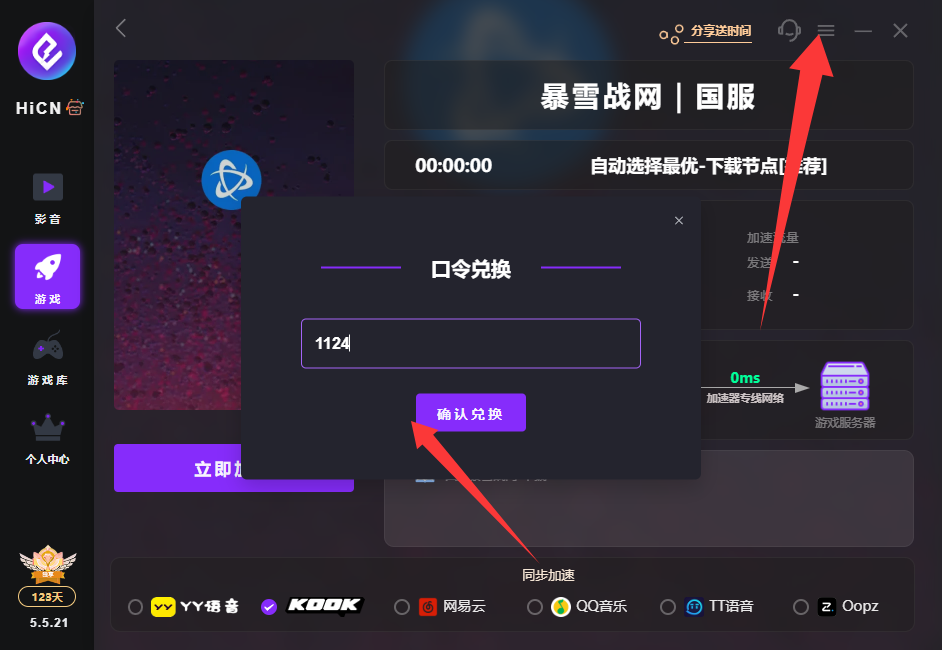 先下载 HiCN 客户端,手机或电脑端都能下,注册后在「我的」界面输入「1124」兑换免费加速时长,然后在游戏库找到 “战网国服” 点击加速,等提示连接成功;