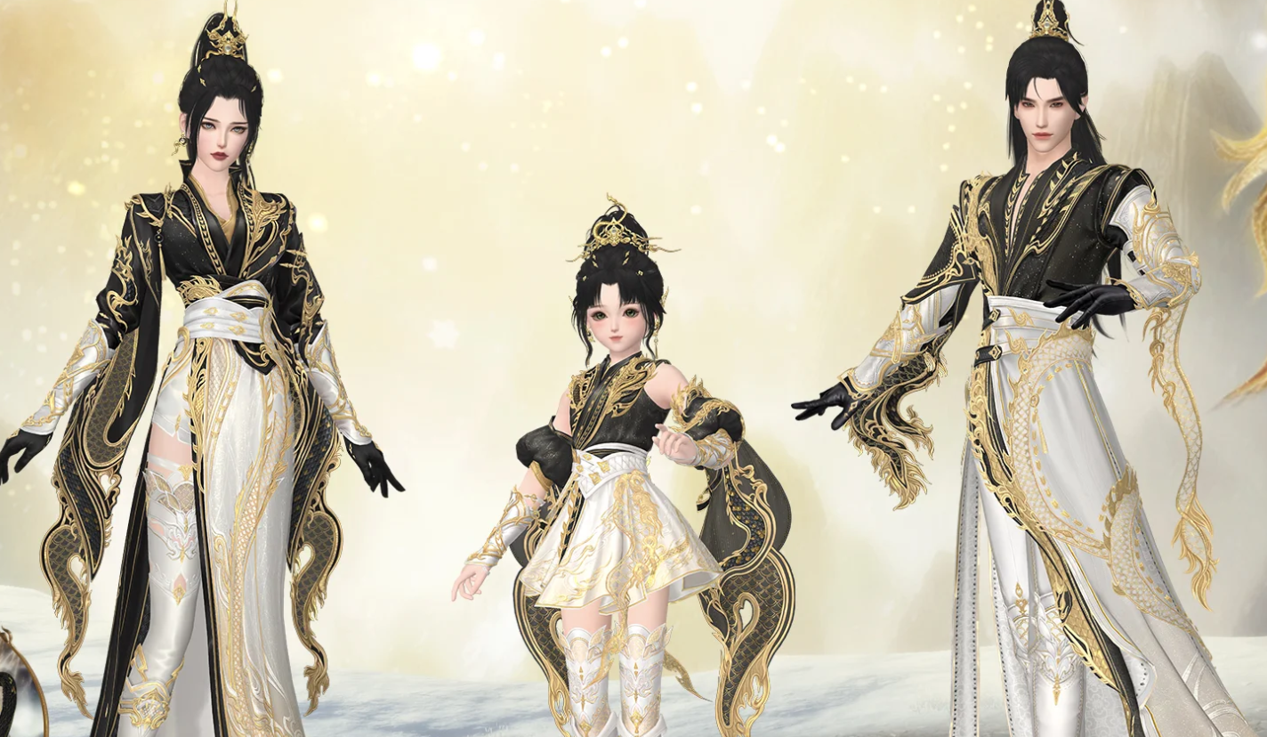 以玄、素、灿金三色为基调,将龙章祥云融入衣袍纹饰,兼具古典宽博与修身利落的形制,尽显威仪与灵动。成男款金龙盘袖、腰束祥云暗纹宽带;成女款金玉冠冕加身,裙摆墨白交叠缀金龙;萝莉款白裙金丝缠绕,游龙纹样恣意灵动。
