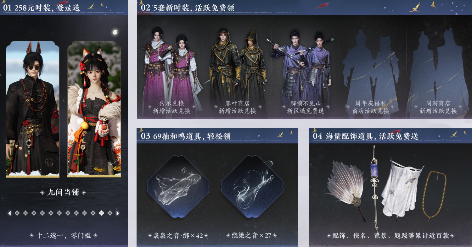 海量道具免费领:参与周年活动轻松获取 42 个袅袅之音・绑、27 个绕梁之音,还有超 90 件免费配饰、动作等外观道具,打造专属江湖形象。