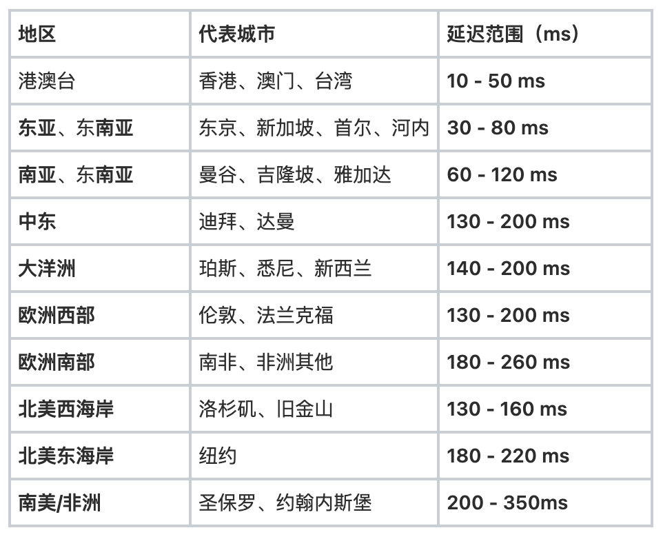 物理距离是硬门槛,离中国越远,理论延迟下限越高。